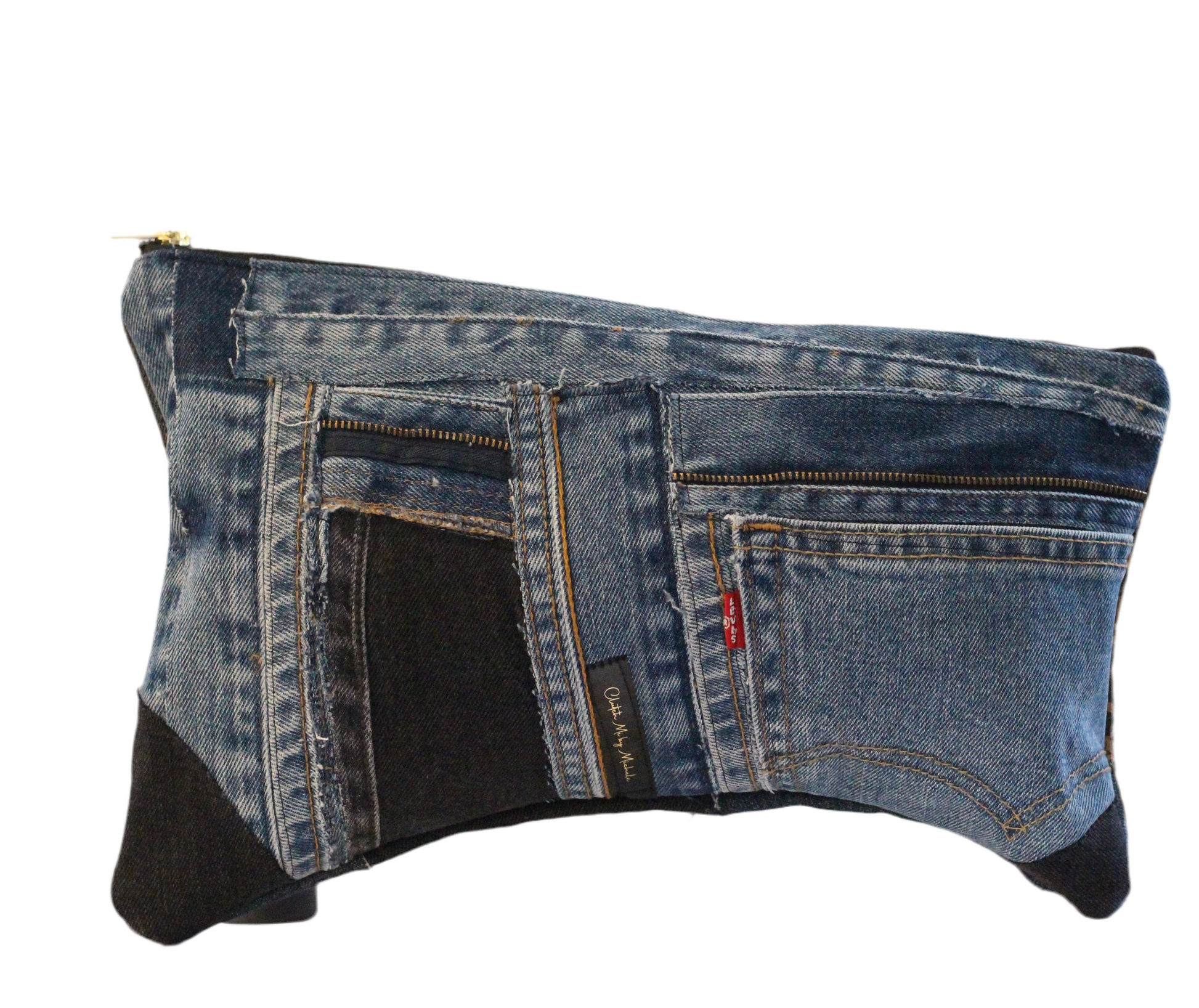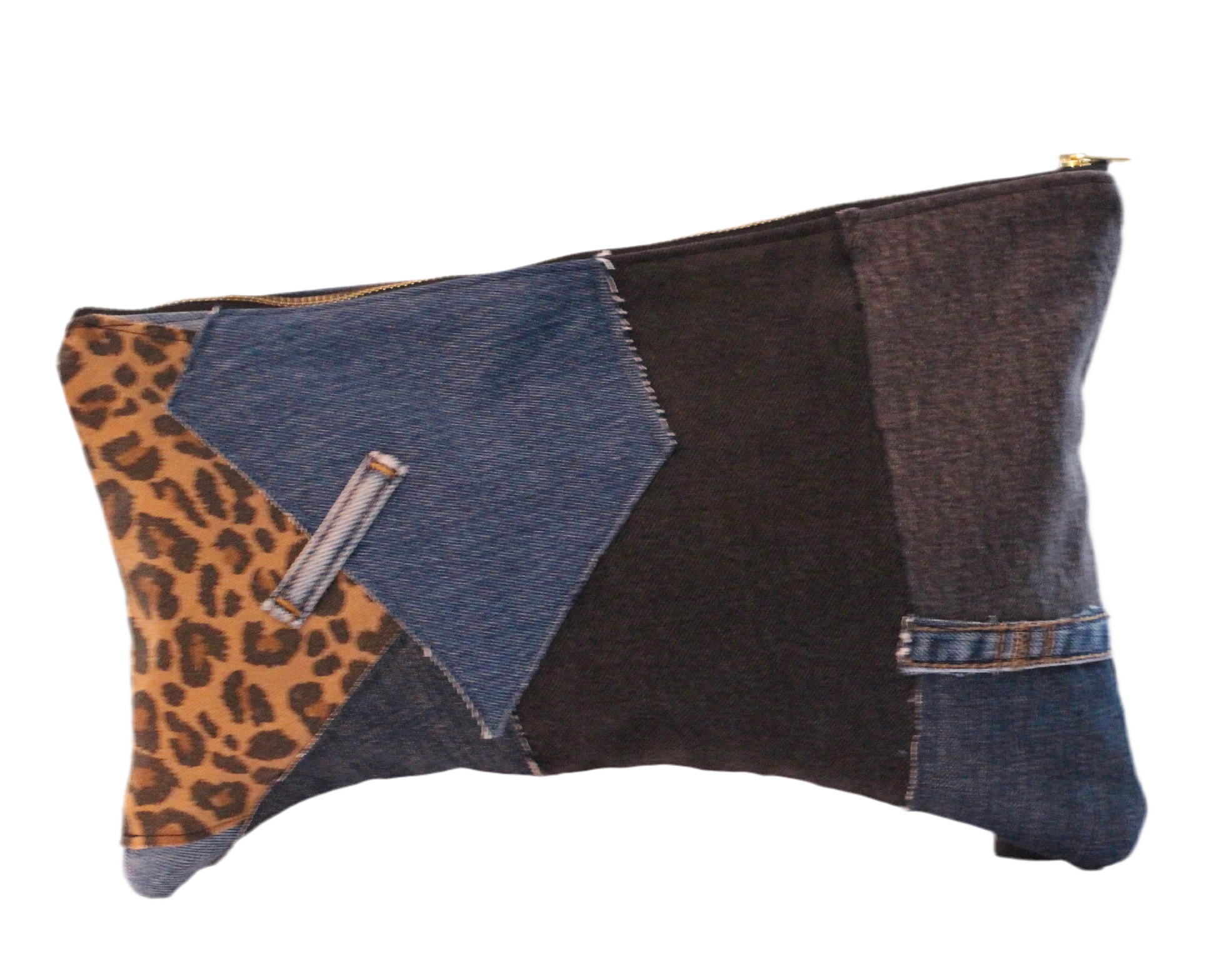 Transform your wardrobe with the Denim Fold clutch! Made from upcycled dark denim, this clutch features a bold gold chain and stunning foil accents, perfect for adding some edge to any outfit. Take a risk and stand out from the crowd with this unique and stylish accessory.
